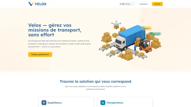 Velox est une plateforme de mise en relation qui permet d’organiser rapidement des livraisons de grande taille partout en Europe. Entreprises et transporteurs s’y connectent pour gérer des trajets longue distance, de manière simple, rapide et centralisée.
