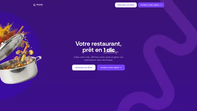 Greasily génère automatiquement un site web pour les restaurateurs, sans qu’ils aient à s’occuper de la technique. Ils gèrent uniquement l’essentiel : la carte, les réservations et les horaires. En quelques minutes, un restaurant dispose d’un site prêt à accueillir ses clients.