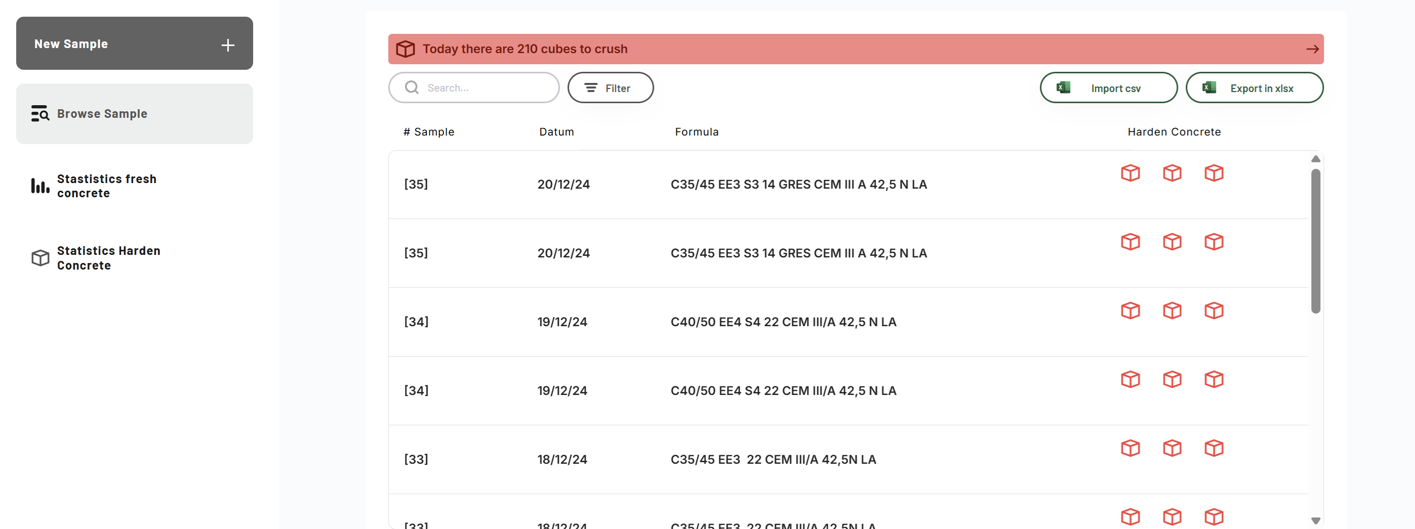 Grâce à Bubble, nous avons créé une application permettant une gestion simplifiée du traitement informatique des échantillons de béton : importation, création de nouveaux échantillons, accès à des statistiques et analyses comparatives.