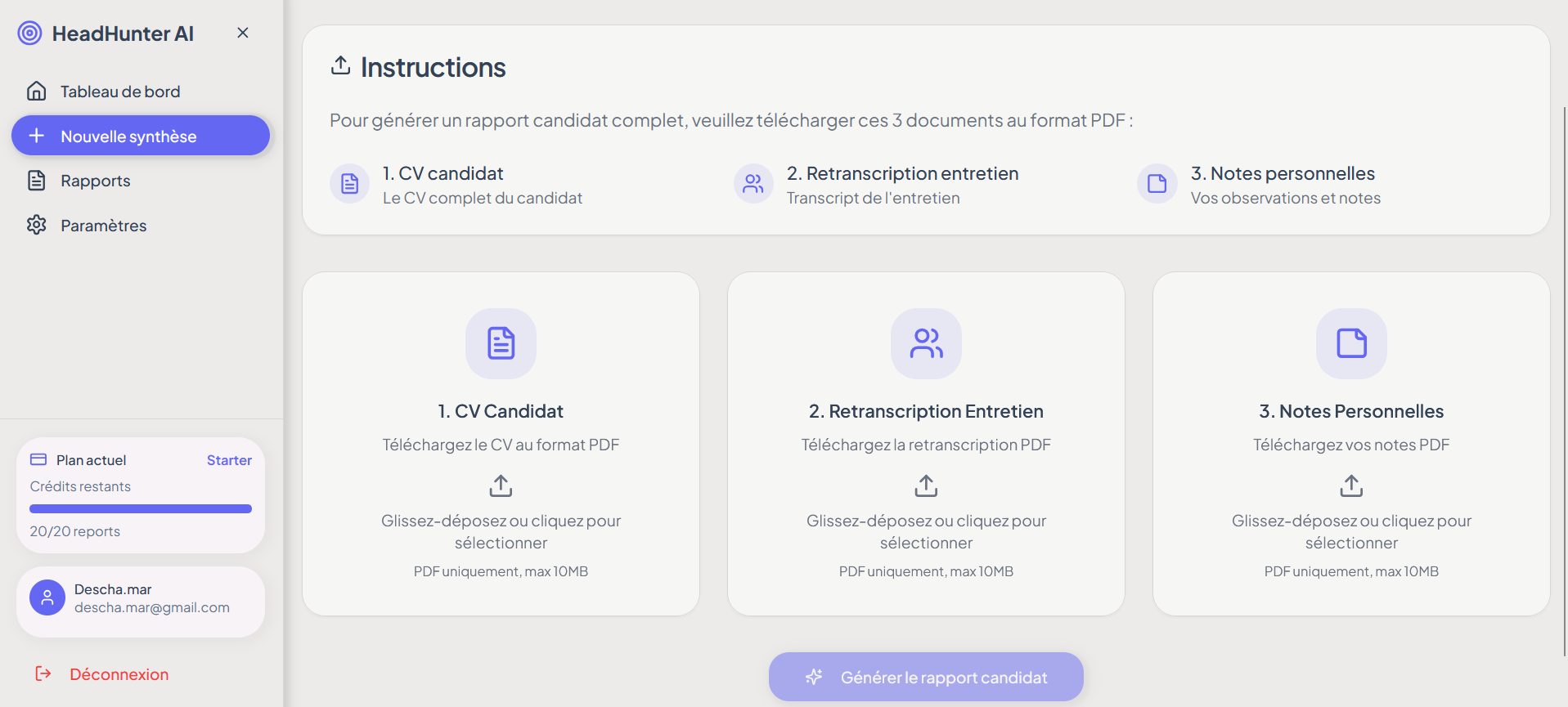 Notre outil utilise l'intelligence artificielle pour analyser vos documents (CV, transcriptions d'entretien, notes) et en extraire les informations essentielles. En quelques instants, obtenez un profil candidat clair, complet et prêt à être partagé.